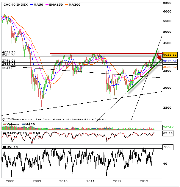Pas de surprises du côté de Ben Bernanke puisque la FED continue donc l’opération open bar. Il faut dire que les chiffres économiques prouvent que la croissance est bien fragile et pour sûr non auto entretenue. la FED n’a d’autres choix que de conserver le malade sous perfusion. Ne vous laissez d’ailleurs pas avoir par le moral des ménages, faussement élevé. Aux USA, la retraite se forge. Et pour cela les américains investissent sur les marchés financiers. Le moral des ménages est donc très corrélé à la hausse de la bourse. Mais ce n’est pas pour autant que ce moral élevé relance la consommation. Bref, l’open bar continue, et la hausse donc aussi. Si bien que la hausse se fait d’une manière parabolique dorénavant sur le cac 40 aussi. Ce qui à terme bien entendu ne remet pas en cause la force des acheteurs, mais à terme laisse présager une correction forte et rapide. Bien entendu la variable reste à savoir le timing parfait. Pour moi, les opportunités mis à part quelques smalls sont maintenant très rares et au mieux je recommande d’être liquide. Les vads en ce moment ne sont qu’anticipation, faîtes ce que je dis pas ce que je fais ;-)