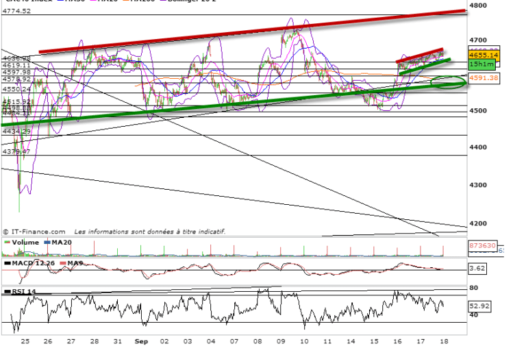 Les jeux sont faits rien ne va plus. à 20h la FED décidera certainement de ne rien annoncer mais pourtant les marchés US seront secoués. Dans un sens puis dans l’autre avant de privilégier un sens qui sera renforcé deux heures durant. L’ouverture du CAC 40 demain risque également de se faire à un gap, délicat de dire dans quel sens alors que le marché fait déjà un beau rebond depuis 3 jours. Si la hausse devait être privilégiée, il est certain que les 4775-4800 seront l’objectif des haussiers. Si la baisse devait être privilégier, les 4550-4570 seraient un objectif avant très certainement un rebond grâce à la moyenne mobile à 20 jours qui se rapproche de ce niveau et va renforcer son support. Si l’on regarde le CAC 40 aujourd’hui, il a poursuivi sa hausse, les 4630 ont servis de support et le CAC 40 se positionne parfaitement neutre à la clôture. Si bien que le potentiel de hausse comme le potentiel de baisse sont à 50/50. Les 4775 peuvent aussi bien être ralliés que les 4570 points. Perso, j’ai préféré solder car au pire je prendrai position demain matin lorsque le sens aura été choisi. De plus avec un gap ouvert sur les 4570, une moyenne mobile à 20 jours qui va commencer à se retourner également sur ces 4570 points, cela fait pour moi un aimant à vendeurs tout d’abord et surtout derrière une sacrée opportunité d’acheter un support béton, à moins que…