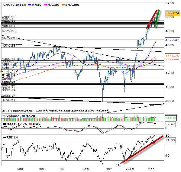 Je voudrais commencer cette analyse CAC 40 par un gros bravo. Un grand bravo à Stefix qui nous avait parlé de la résistance des 5060-5070 points comme étant le point haut et donc une position parfaite pour vendre le marché. La journée lui donne raison et je suis moi même convaincu. La pente ascendante du CAC 40 est intenable. C’est impressionnant cette euphorie et déconcertant en même temps. Impossible de savoir si le marché ne va pas poursuivre sa hausse. Mais en tout cas on est sur des résistances importantes mais la consolidation ne sera pas valable tant que le CAC 40 ne va pas sous les 5020-5025 points. Pour moi donc le CAC 40 reste haussier tant que nous restons au-dessus des 5020-5025 points. Donc pour demain, haussier mais la pente ne pourra perdurer encore bien longtemps. Donc point pivot sur les 5025. On jouera la baisse sous les 5025 avec confirmation sous 5020 et fermeture du gap haussier ouvert ce jour. Maintenant au-dessus des 5025, la hausse prédomine alors attention à anticiper le retournement. Le marché étant bien euphorique.