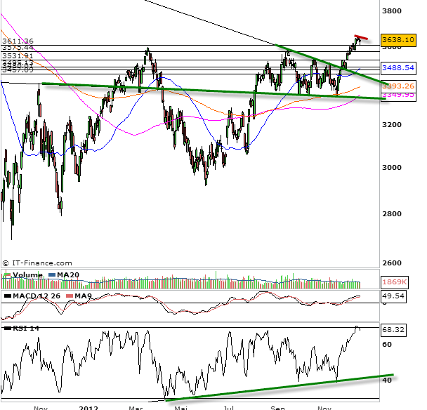 La consolidation a donc démarrée sur le cac 40 dès l’ouverture. Mais la clôture ne nous permet pas de la confirmer. En effet, la rupture des 3620 points n’est pas effective en clôture, et donc nous avons un nouveau signal que les acheteurs tiennent le marché. Sans doutes, le tiennent-il à défaut de news pertinentes à trader. Sans doutes pour cause de faibles volumes qui ne poussent vraiment pas grand monde à se lancer. Ce qui valide encore plus le fait, qu’il faut se méfier de l’envie d’anticiper une tendance. La tendance reste donc haussière au-dessus des 3620 points. Bien entendu, tout le monde se méfie de la consolidation. Mais au-dessus des 3620, ce dont il faut se méfier le plus c’est d’anticiper et d’entrer en contre tendance. Bien entendu, la consolidation, semble la suite la plus saine, mais les faibles volumes et les fêtes de fin d’année peuvent pousser les indices facilement encore plus haut et ce de manière irrationnelle tout simplement, car il manque des contreparties Il faut donc toujours se méfier du mois de décembre, qui est capable de mettre en place une tendance avec très peu d’acteurs et donc peu pertinente.