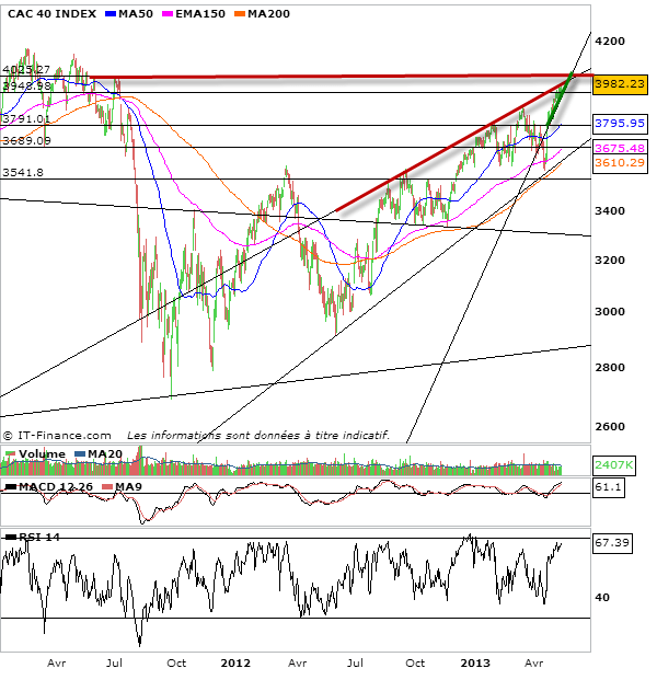Opinion haussière au-dessus de 3950 points. on reste prudent, toute news pouvant faire consolider fortement les marchés.
