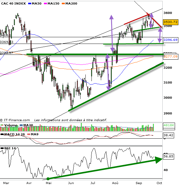 Premièrement. La tendance de fond est haussière depuis que le CAC 40 a décidé cet été de rompre à la hausse une figure de tasse avec anse avec ligne d’eau à 3293 points. Autant dire que la tendance de long terme demeure haussière au-dessus des 3293 points.