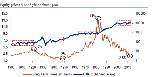 Titre volontairement racoleur, qui devance ce qui vous allez bientôt voir dans la presse financière si un rallye haussier se met en place.Voici une vue très long terme du dow jones. on peut voir que ce marché a connu 3 périodes dans son histoire de consolidation à plat dans un trading range et que nous connaissons actuellement la quatrième. A chaque fois la sortie s’est faite par le haut donnant lieu à des marchés haussiers forts. Le tableau ci-dessous montre l’évolution de la bourse depuis 1900 et également des obligations. Si certains pensent que le marché actuel ressemble au marché des années 70 en fait il semble avoir plus de ressemblances avec le marché d’après guerre. Le graphique ci-dessous montre un facteur multiplicateur proche de 5 à chaque fin de trading range. Mais il faut dire que depuis 1975, c’est surtout grâce à la fin de l’étalon or, que la monnaie fiduciaire a pu financer tout cela, et c’est toujours encore plus que jamais d’actualité.