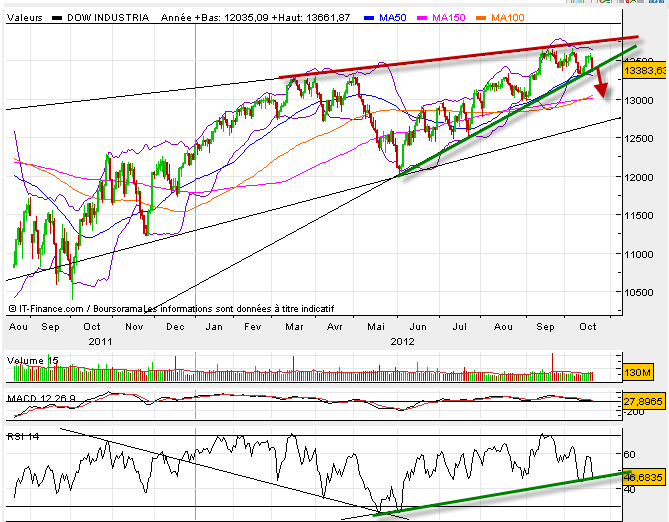Il faudra suivre la clôture du Dow Jones ce soir, car celui-ci est revenu au contact de son support oblique. Support de la figure en biseau ascendant. Cette figure en biseau ascendant semble témoigner de la faiblesse de plus en plus forte de l’indice américain. Sans pour autant remettre ne question la tendance haussière de fond la cassure baissière du biseau ascendant pourrait donc renvoyer le dow jones sur les 13 000 points. C’est là que le pivot de la tendance long terme se trouve. La fin octobre sera donc très importante pour la suite et notamment pour la préparation du fameux rallye d’hiver qui cette année pourrait bien ne pas confirmer les statistiques, en n’ayant pas lieu ? Il faudra encore une fois se méfier des certitudes.