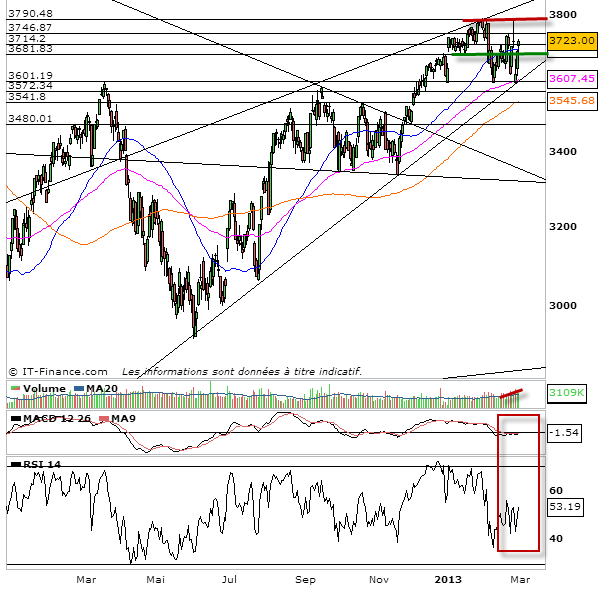 Pas grand chose à dire sur l’analyse graphique du cac 40 aujourd’hui. le plus important est de constater que le cac 40 s’est soutenu sur les 3680 points. Ce n’est pas innocent puisque du coup ce niveau, pivot, redevient un support de choix pour les haussiers. Du coup le marché donne maintenant plus la main au acheteurs. Il manque encore de pouvoir s’affranchir des 3750 points, mais dorénavant, les haussiers préparent le terrain pour aller chercher un nouveau test des 3790 points. Pour se couvrir de ce scénario haussier qui semble s’engager, il faut utiliser les 3680 points. toute re-cassure à la baisse de ce niveau relancerait une baisse et donc la continuation de notre yoyo de ces derniers jours.