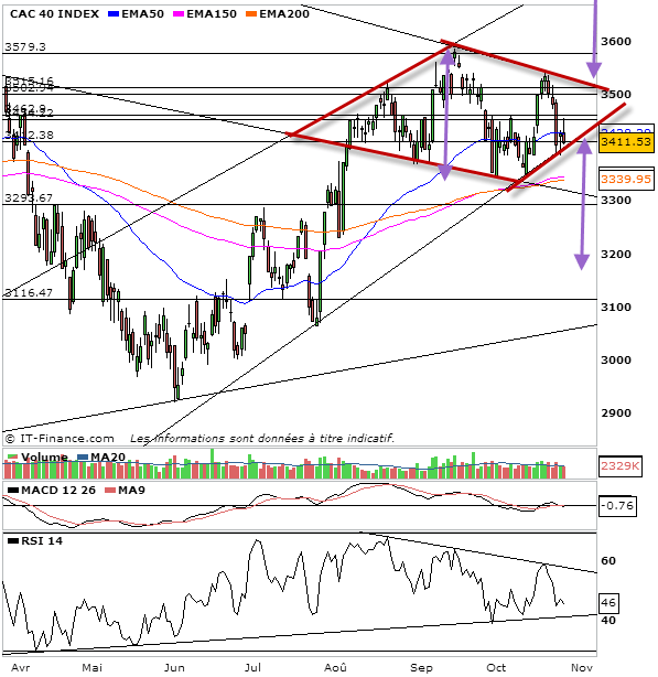 A très court terme, sous 3430-3438 points, ça reste négatif sur cac. Mais tout de même autour du point pivot des 3407 points, cela tient bien, alors verdict demain ! 3390 en stop. Passage des 3438 en signal acheteur.