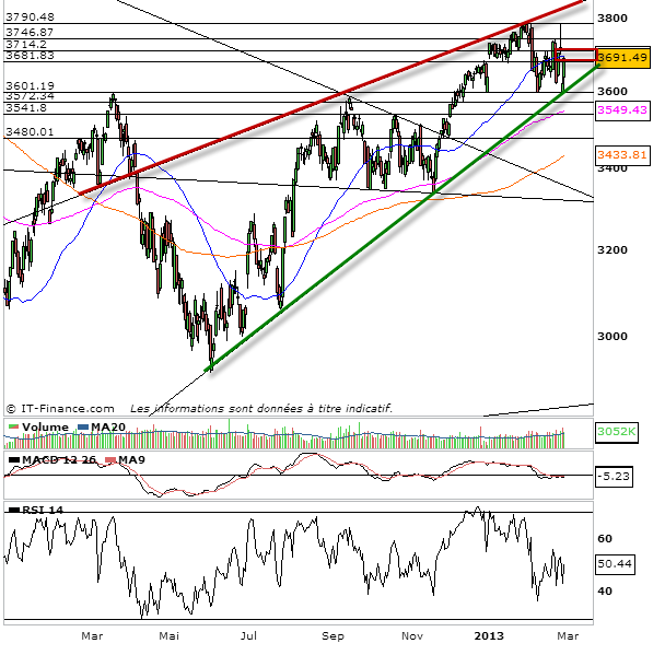 Une question à laquelle je suis sans réponse pour le moment. Je continue de trader ce marché. Je suis en rentré à l’achat aujourd’hui sur Alcatel et Crédit agricole en fin de matinée puis en milieu d’après midi mais sans avoir l’audace de conserver à la clôture face à un marché yoyo piégeur et à l’arrivée de la zone pivot 3690-3710.