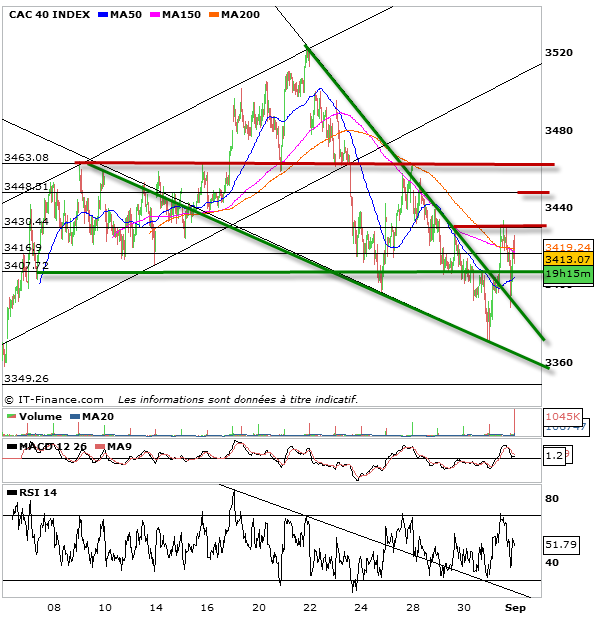 La séance demain sera donc particulièrement importante et dure à juger. Mon opinion est neutre dans le range 3407-3430 points. Au-dessus des 3430, les haussiers reprendraient la main en visant les 3447 puis les 3463. ce n’est qu’au dessus des 3463 qu’un courant acheteur fort reprendrait forme, en attendant et sous 3463 il convient de rester sur ses gardes.