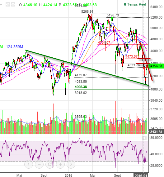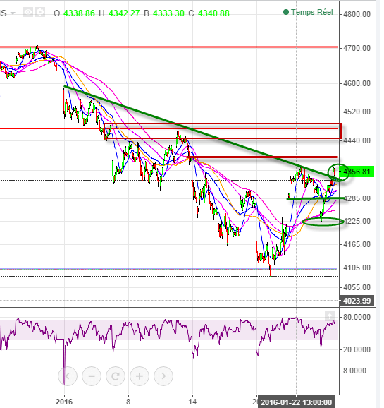Passer cette zone ou échouer, là est la tendance de ces prochains jours qui se dessine. Le test des 4390-4400 est à privilégier pour demain. Mais le plus important sera de voir la réaction des vendeurs sur ce test. Soient ils lâchent prise et alors c’est la porte ouverte aux 4470.