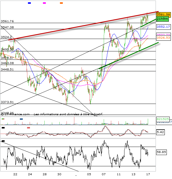 Seule une cassure des 3525 points pourrait dorénavant mettre à mal la tendance haussière. La figure en biseau est encore longue mais elle doit amener une certaine prudence dans vos trades.