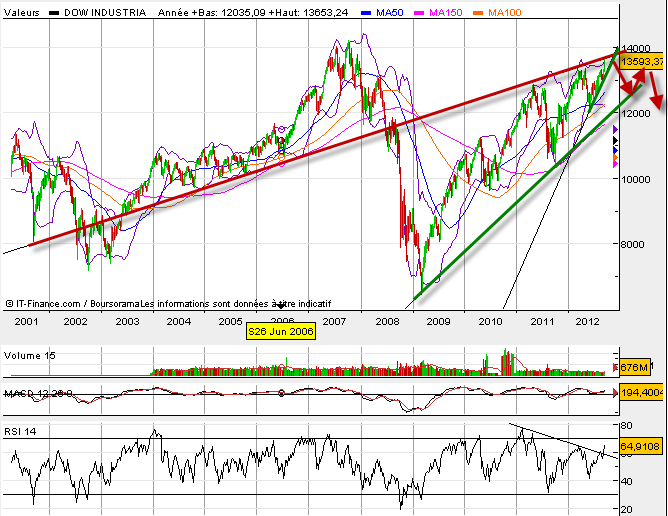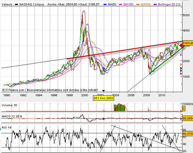 biseau ascendant en hebdo sur indices majeurs…bien entendu si ces biseaux ascendants cassent à la hausse ce qui est le moins probable, on assistera sur une bulle haussière sur le marché action… A suivre de près