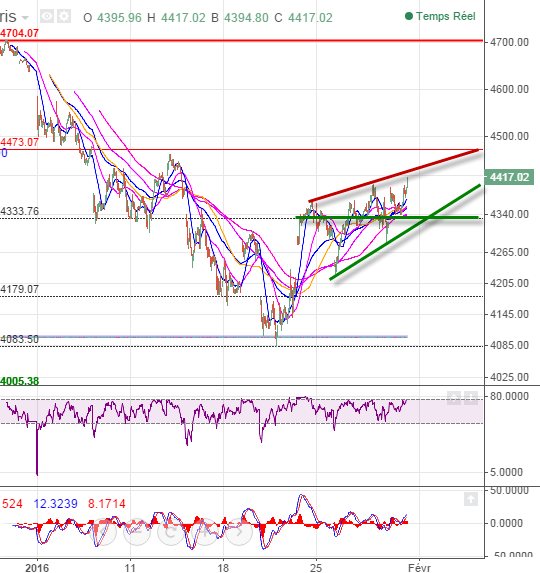 On se retrouve donc avec une zone pivot 4320-4340. Au-dessus on privilégie la poursuite du rebond, même si on va rapidement arriver sur de nouvelles résistance 4440-4470 points.
