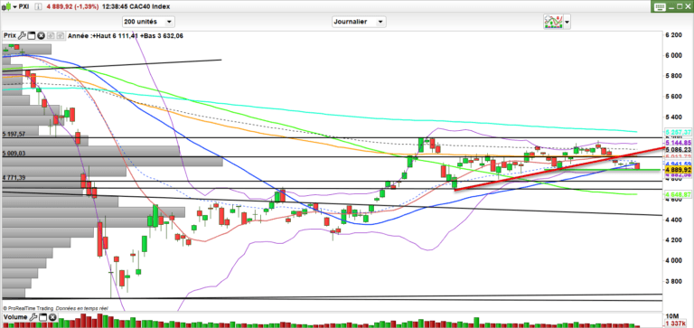 Dégradé, le CAC 40, lui l’est déjà depuis plusieurs séances, et accentue un peu plus cela ce jour en rompant les 4950 puis 4920 qui deviennent résistances. En dessous donc, à court terme on restera prudent. La zone des 4890-4900 est à nouveau testée, et en dessous, on validera la fragilité avec une prise en main des vendeurs qui pourra s’accélérer suivant la confiance des opérateurs dans ce qui sera annoncé. Le risque est donc un retour de la volatilité, où on sent bien que les acheteurs qui restent sont prêt à partir en vacances à la moindre crainte.