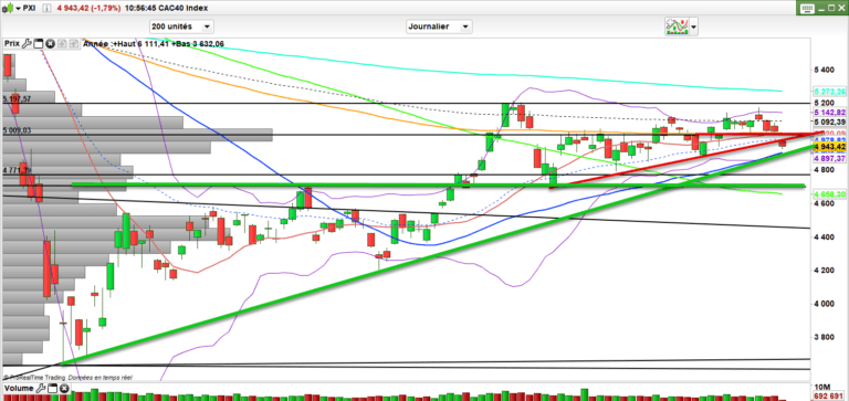 On a donc engagé la dégradation après la faiblesse d’hier déjà en échec sous les 5080 points. La dégradation s’est activée dans le sillage des US avec l’ouverture en gap baissier sous les 5010 points. Sous ce niveau, le marché est en correction. Mais il ne faut pas tuer les taureaux trop vites. A ce stade il reste encore beaucoup de supports avant de parler des 4700 – 4500 points et notamment en premier lieu la zone des 4900 points où l’on retrouve de nombreux soutiens graphiques. Rapidement, certains titres peuvent revenir à des niveaux intéressants.