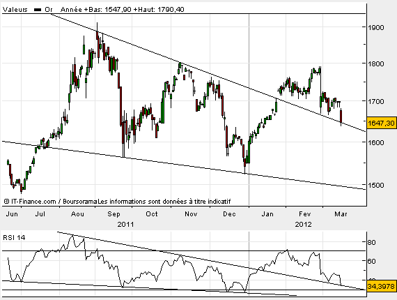 voici un graphique sur l’or pour ceux qui le suive, qui met en évidence un magnifique pull-back sur l’ancienne oblique baissière d’un biseau descendant. Aussi l’or vient de valider sa sortie par le haut, idem sur le RSI.