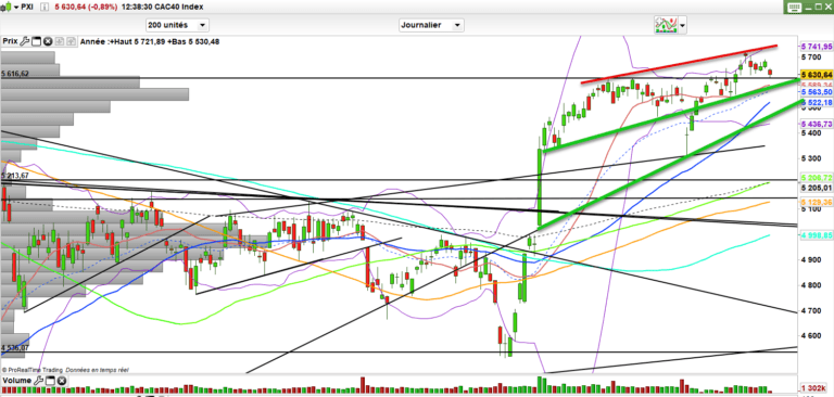 Au niveau du cac on semble l’acter ce matin. Alor il convient de ne pas jeter le bébé avec l’eau du bain car on reste au-dessus de supports importants, mais on entamer la reprise de souffle qui devrait nous faire revenir tester la zone des 5580-5610 points.