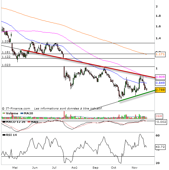 Il faudra donc privilégier l’achat sur rupture des 0,801€/0,812€ et privilégier la baisse sur cassure baissière des 0,763/0,78€