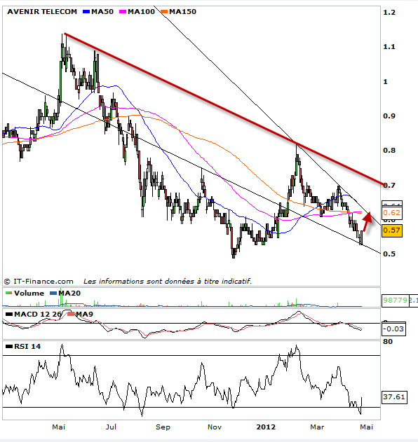 L’action Avenir telecom prend 5% aujourd’hui à la bourse de Paris, l’occasion de s’intéresser à nouveau au titre dans une tendance long terme baissière mais qui devrait avoir l’opportunité d’engager un rebond, poursuivant la reprise du jour sur cassure des 0,58 euros pour viser les 0,63 euros. On ne sera guère plus gourmand pour le moment. On va donc initier un achat sur les 0,58 euros et donc matérialisation de la cassure des 0,57 euros uniquement sinon on patientera encore avant de rentrer, dès le passage des 0,57 euros on devrait pourvoir initier une poursuite du rebond haussier vers les 0,62/0,63. on mettra le stop sur 0,55 euros.