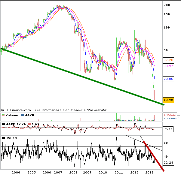 L’action Belvedere en bourse est massacrée depuis quelques semaines. Bien entendu, il s’agit donc là d’une action pour investisseurs avertis. La tendance baissière ne fait aucun doute, et rien ne laisse entrevoir un retournement durable de la tendance avant plusieurs mois. Dans ce cadre, cette action est donc uniquement pour des profils d’investisseurs spéculatifs qui sauront être attentif, avoir du temps pour suivre les cours, et ne pas hésiter à prendre leurs profits. Comme on peut le voir sur le graphique, l’action est entrain de terminer sa capitulation. Cela veut dire que l’on va arriver sur une oblique support non loin de là qui devrait faire renaître l’appétit de quelques acheteurs spéculateurs. C’est à l’approche de cette oblique qu’il faut s’intéresser à acheter des actions belvedere. Mais surtout il faudra voir si cette oblique tient tout d’abord. Inutile d’acheter par anticipation. Surveillez donc les bougies qui se formeront aux alentours des 10.50 euros. Cela donnera une indications pour passer à un achat spéculatif sur Belvedere et s’engager dans un rebond technique, mais rien de plus.