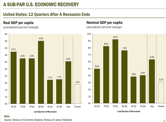 Le premier graphique résume que la reprise économique que nous connaissons actuellement, tout du moins pour les US, est la plus faible depuis 50 ans.