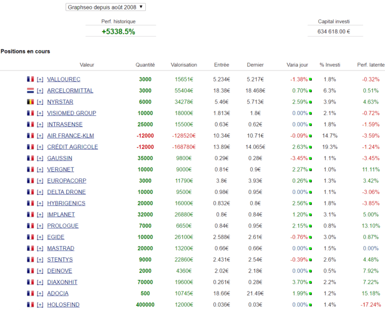 Julien Flot est Investisseur pour compte propre depuis 2006 et vous aide en toute transparence au quotidien à mieux investir en bourse. Julien est comme vous, il a un jour voulu débuter en bourse, rapidement perdu quelques milliers d'euros avant d'apprendre de ses erreurs, bâtir une stratégie et l'appliquer avec discipline. Aujourd’hui grâce à sa "stratégie du moindre risque" il est devenu un investisseur qui bat régulièrement le marché ! Sur Graphseo bourse, il partage depuis 2008 ses succès, échecs, conseils, analyses et investissements pour vous aider à mieux investir et gagner en bourse à moindre risque ! Découvrez l'histoire de Julien Flot ici.