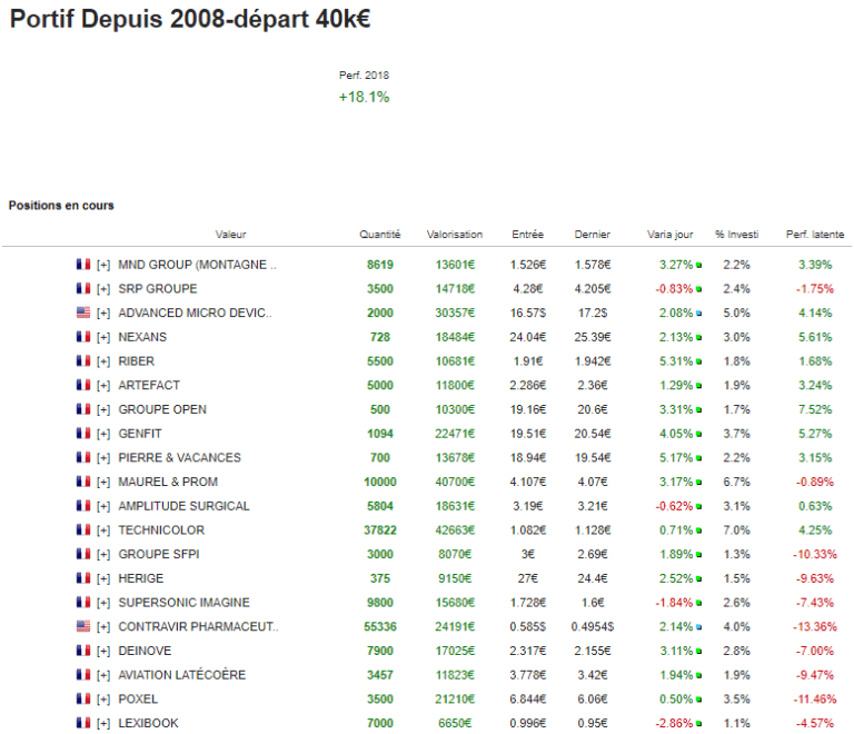 Ainsi hier, j’ai notamment acquis des titres balyo, Nexans et accumulé st microelectronics. J’ai également sorti vallourec hier faut de vouloir me surexposer. j’aurai du. Pas en réussite sur mes spéculatives américaines, j’ai soldé marathone, riot et une partie de contravir. J’ai pris en plusieurs fois AMD pour un rebond spéculatif. Puis j’ai vendu fnac qui miraculeusement ne m’a pas fait perdre d’argent. J’ai également accumulé genfit et maurel et pro. J’ai vendu au final rallye, pris mes profits sur Compagnie des alpes et sur trigano un poil tôt. Mais toujours plus facile après coup.