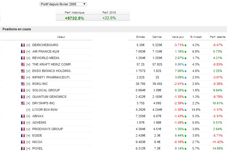 Je continue donc de réduire la voilure au grès des possibilités. J’ai notamment soldé Onxeo en pv de 6% ce matin suite à annonce ainsi que Tarkett pour une pv de +7%. Soldé également Antalis pour une perte de 7%