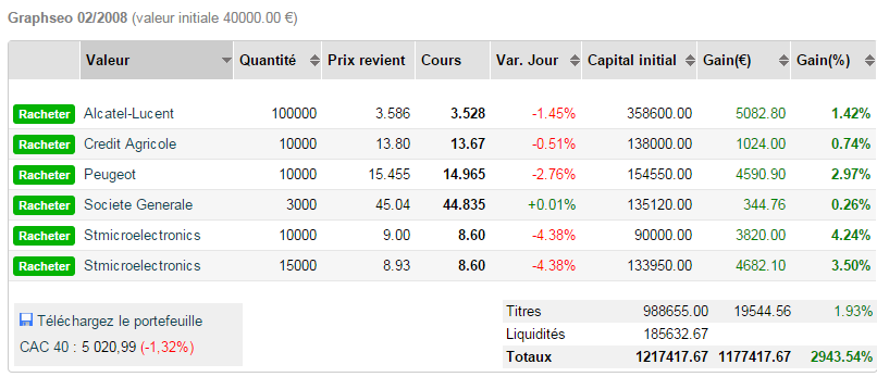J’ai réussi à charger un peu plus la mule ce matin en St microelectronics mais bon dommage que ce soit une action que je suis en vad depuis une semaine qui fasse la plus grosse baisse du jour du portefeuille alors même que j’ai décidé, pour prendre moins de risque, de me diversifier à la vad sur plusieurs valeurs. Ainsi va le monde de la bourse. Même si cela paye moins bien ce soir, je sais que la diversification était la meilleure décision pour profiter au maximum de la baisse du jour. Il est certain qu’a être all-in sur une seule valeur on peut profiter encore plus des hausses et des baisses mais seulement si on a choisi la meilleure valeur et là pour une fois où c’est le cas, neuf fois sur dix ce n’est pas le cas. Donc pas de regrets sur STM d’autant que j’ai tout de même réussi à rajouter au pot ce matin, mais il n’y a pas eu assez de volumes pour que je sois servi pleinement, j’avais passé un ordre fragmenté pour récolter le double de ce que j’ai eu. Mais bon pas de regrets, cela fait du bien d’être en vad et de voir le portefeuille vert. Encore une fois on voit l’utilité d’avoir le timing en bourse, mes convictions furent surement justes depuis plus d’une semaine, mais je n’ai pas eu le bon timing et ai voulu anticiper la baisse trop tôt. Demain, la stratégie est de conserver les positions en plaçant des stops wins 0,4% au-dessus du cours d’ouverture, afin de solder au moindre rebond tout simplement car demain c’est le dernier jour SRD et je ne tiens pas à proroger. Donc le but demain, racheter toutes les positions au mieux et on verra vendredi ce que l’on fait selon le marché.
