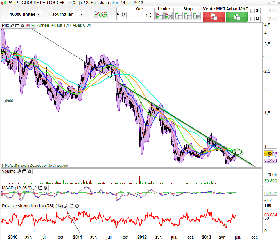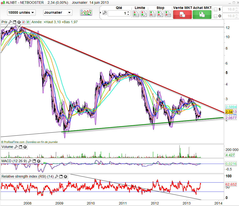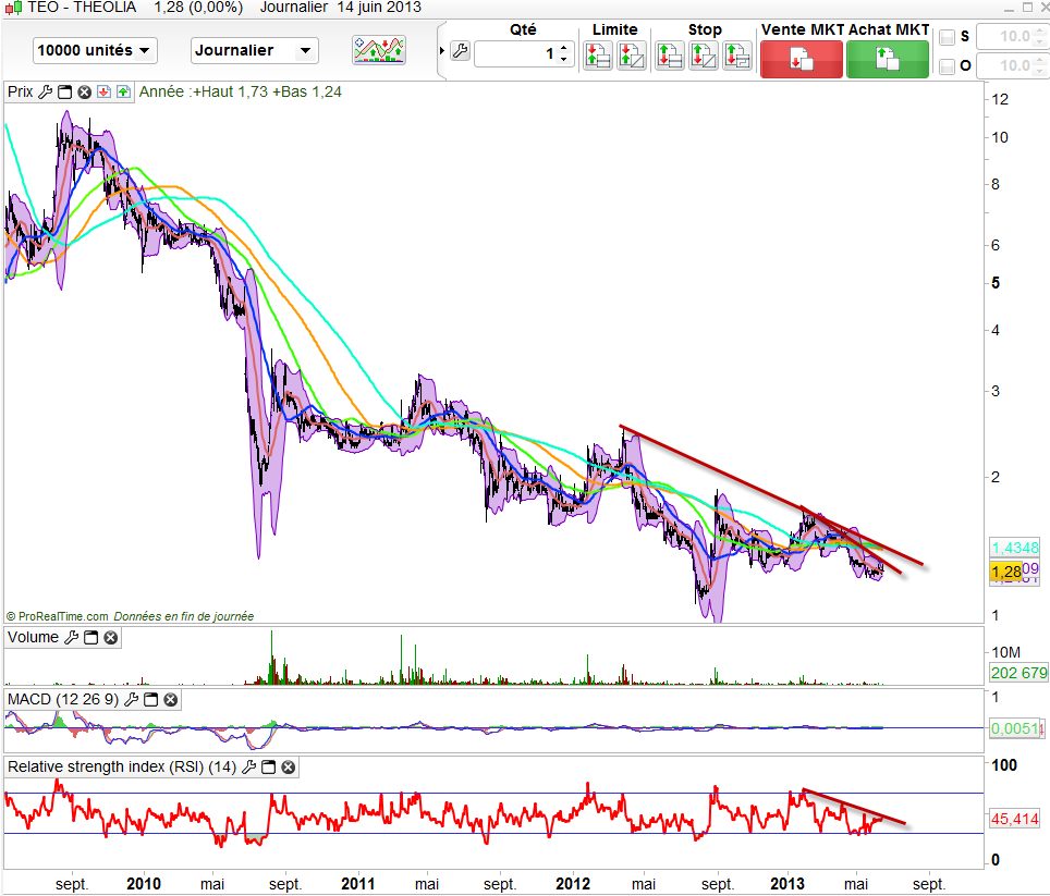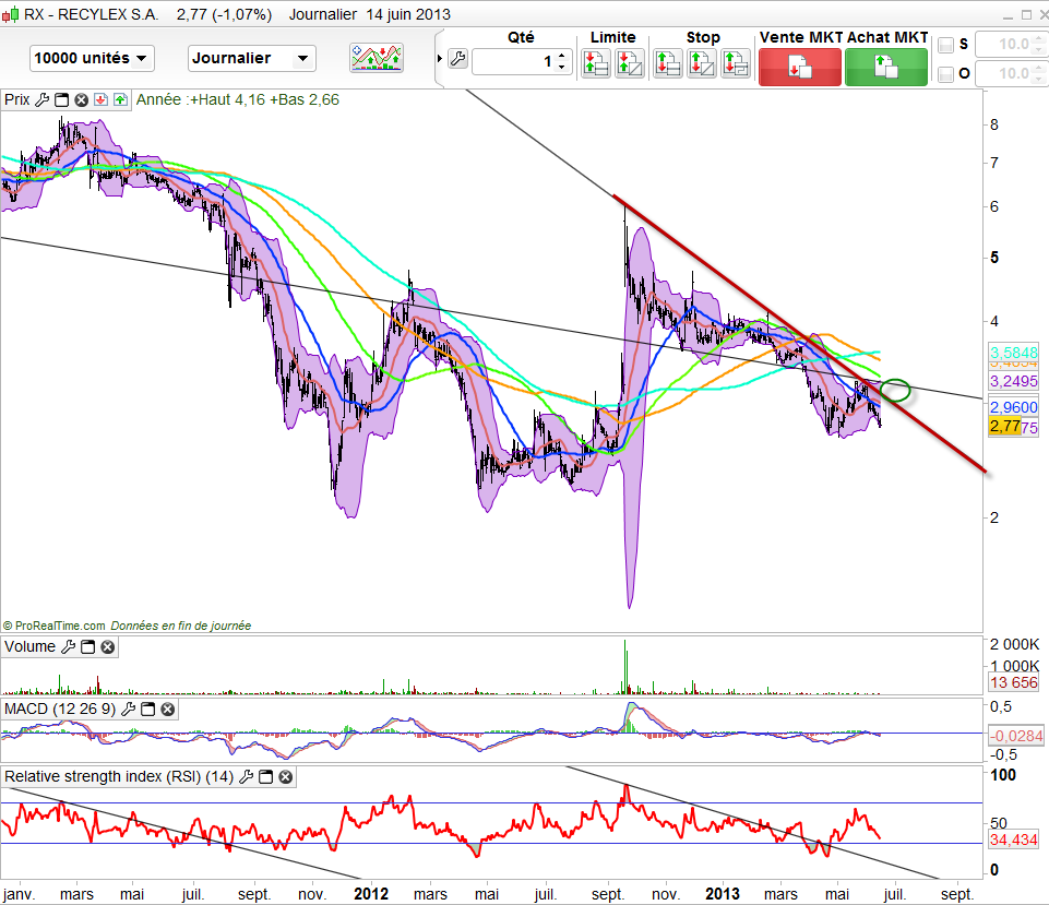 Alors que les marchés se cherchent, il n’y a pas beaucoup de signaux d’achat à se mettre sous la dent. Beaucoup de valeurs qui ont fait la hausse ces derniers mois se retrouvent dans des configurations de fin de hausse. Alors que d’autres valeurs qui n’ont pas participé à la hausse, se retrouvent souvent dans des biseaux descendants ou encore des triangles symétriques. Sans y trouver une relation de cause à effet ou y voir des signaux positifs sur ces valeurs, je crois que même en absence d’opportunités il faut continuer à exercer son Å“il et à suivre ce genre de figures et configurations. Alors voici une petite sélection pour faire travailler nos yeux chers graphs et continuer de « bouffer du graph ». Les commentaires peuvent maintenant inclure des images et donc vos analyses , alors n’hésitez pas à partager ;-)