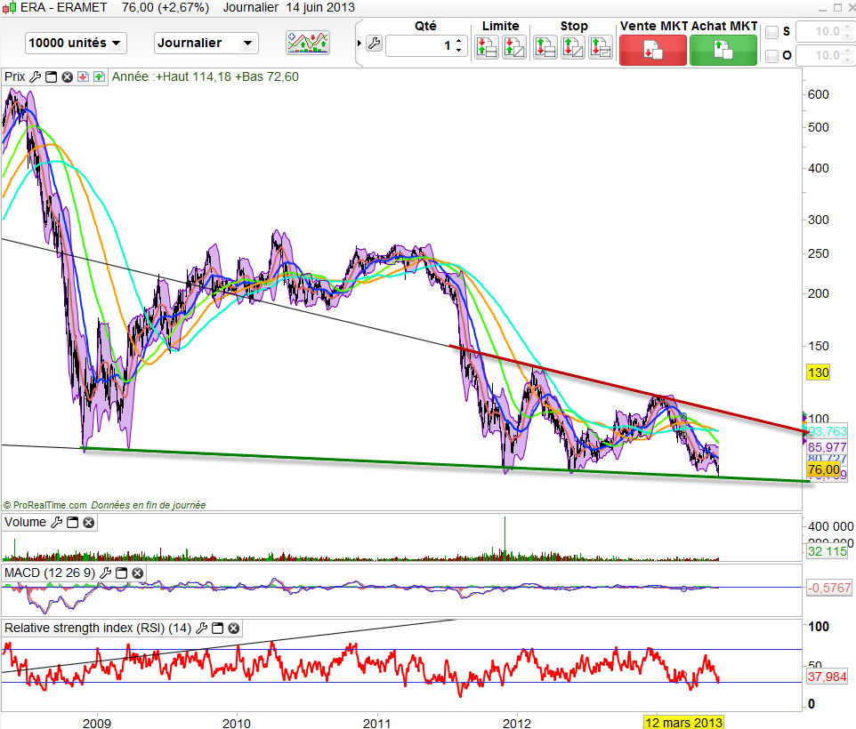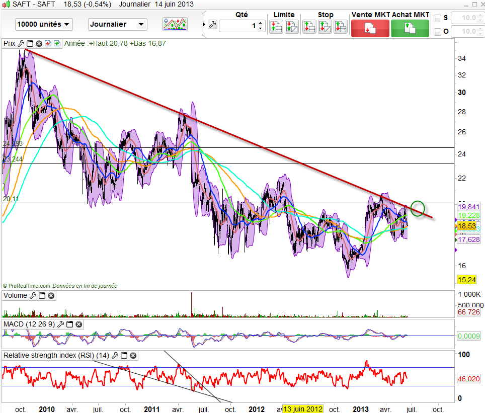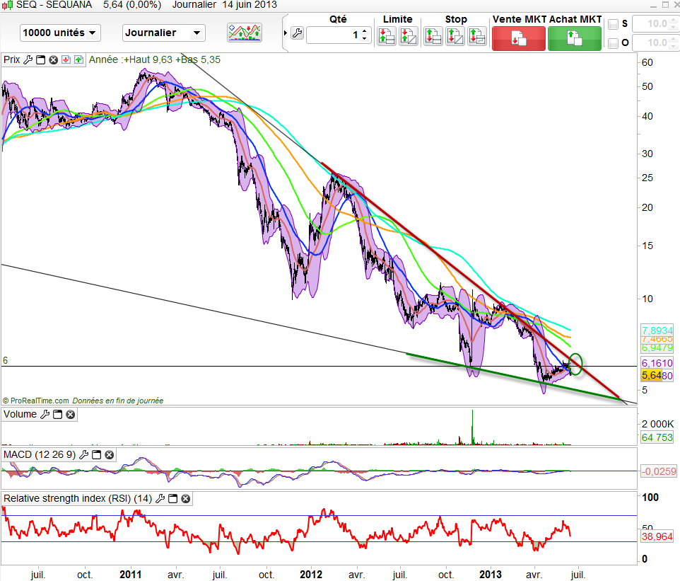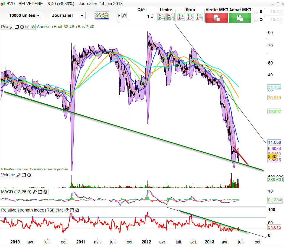Alors que les marchés se cherchent, il n’y a pas beaucoup de signaux d’achat à se mettre sous la dent. Beaucoup de valeurs qui ont fait la hausse ces derniers mois se retrouvent dans des configurations de fin de hausse. Alors que d’autres valeurs qui n’ont pas participé à la hausse, se retrouvent souvent dans des biseaux descendants ou encore des triangles symétriques. Sans y trouver une relation de cause à effet ou y voir des signaux positifs sur ces valeurs, je crois que même en absence d’opportunités il faut continuer à exercer son Å“il et à suivre ce genre de figures et configurations. Alors voici une petite sélection pour faire travailler nos yeux chers graphs et continuer de « bouffer du graph ». Les commentaires peuvent maintenant inclure des images et donc vos analyses , alors n’hésitez pas à partager ;-)
