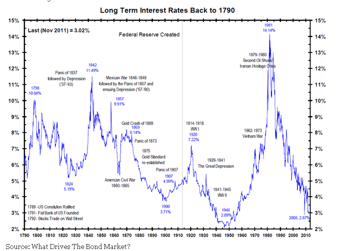 Voici en un graphique plus de 200 années d’historique de la fluctuation des taux d’intérêts.