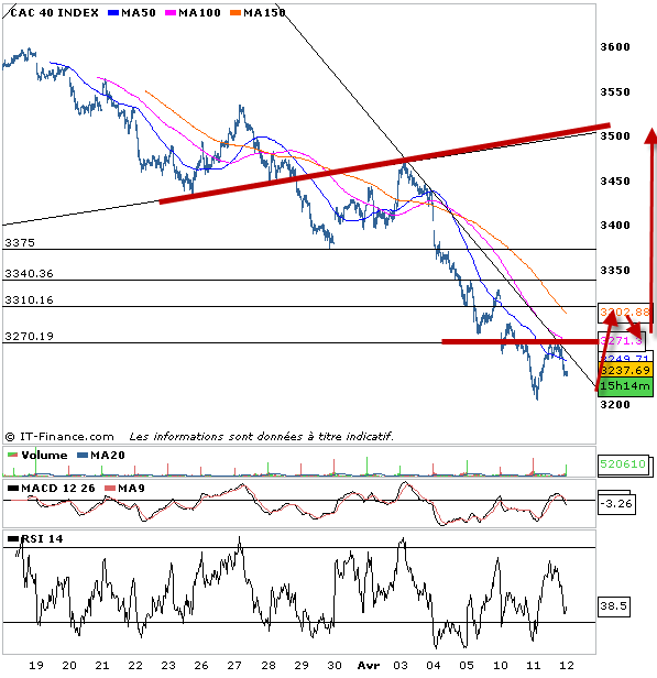 En attendant, la tendance reste baissière sous 3270 points. Mais on reste bien proche de sa souris, dès dépassement pour passer les premiers ordres d’achat. Sous ces 3270, c’est baissier donc méfiance, le risque demeure de rompre 3200 pour aller chercher les 3150 voir en excès baissier les 3030. Mais ce n’est pas le scénario que je privilégie. J’attends donc le passage des 3270 pour passer à l’achat. Et tant que cela ne se valide pas je rabaisse au fur et à mesure mon point pivot.