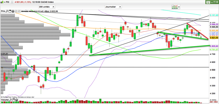 Au niveau du CAC 40, fidèle à lui même, plus inquiet de nature, et moins axé techno, il corrige avec un nouveau gap baissier après celui des 5050 qui avait déjà annoncé la dégradation. On valide donc cette dégradation sous les 4930-4950 points. Pour autnat pas de quoi encore crier au retournement baissier etc, il reste des supports qu’il conviendra de rompre avant cela et notamment la zone des 4800 points.