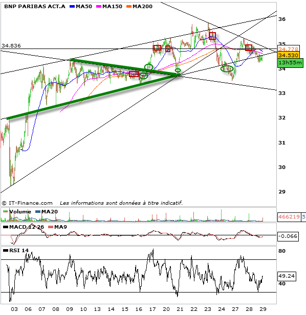Mon objectif serait de voir se réaliser une longue consolidation sur BNP en biseau descendant, le support oblique étant le prolongement de l’ancienne résistance oblique du triangle isocèle donc peu ou prou sur 33 euros en ce moment. Cependant le peu de volumes ne m’engage pas dans la confiance. pour le moment je conserve ma vad avec cet objectif en tête et j’ai placé mon stop sur les 34,84 euros, un pivot qui a souvent inversée les tendances.