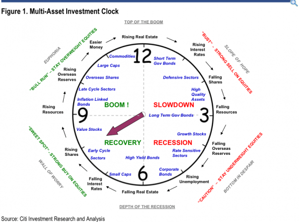Citigroup me délecte en publiant la roue non pas de deming mais la roue du cycle économique et de performance des marchés financiers. C’est l’horloge de l’investissement qui suivant où on se trouve niveau cycle économique, vous dit s’il faut investir ou pas. Pour citigroup et je suis assez d’accod avec cela, on se trouve aux alentours du 20 heure. Le pire est donc derrière nous, nous assitons aux dernières vagues d’indécision et de doutes qu’il y a avant tout nouveau boom économique et hausse des actions qui s’ensuit. Citigroup nous annonce donc qu’il sagit de la meilleure pèriode pour investir en bourse.