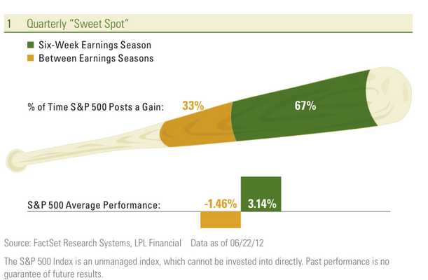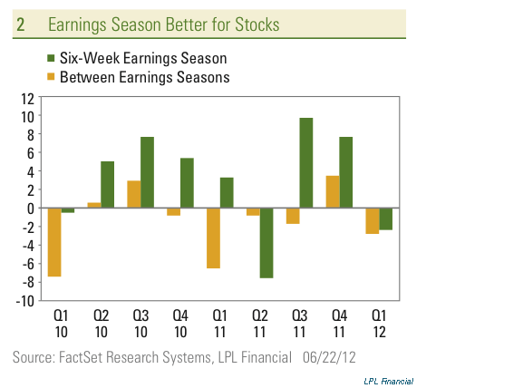 On s’approche maintenant des annonces de résultats des entreprises du second trimestre 2012.L’occasion de s’interesser aux statistiques pour entrevoir justement que les résultats du premier trimestre donnent souvent lieu à un baisse des marchés alors que l’annonce des résultats du second trimestre permettent souven d’attaquer une nouvelle période de hausse pour les marchés boursiers. Le mois de juillet fait en moyenne une hausse de 3,1%.