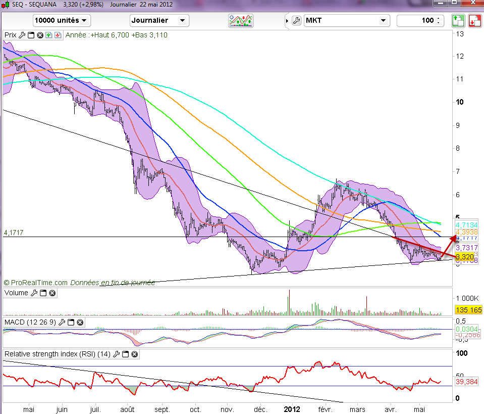 Même chose pour Sequana, potentiel de rebond sur 4,20 euros en cas de rupture haussière des 3,50 euros.