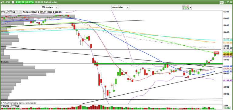 Donc CAC 40, voir si on peut aller chercher 5000-5010 puis prudence sur une conso. 4790 en support. Au-dessus on soufflera au prorata de la hausse sans handicaper le mouvement. En dessous, entrevoir 4690 voire 4580. pas plus pas moins, on attend la suite avant de décider. En attendant, haussier avec donc volonté surement d’aller chercher un chiffre rond et le plaisir donc de continuer à sortir les vendeurs à découvert.