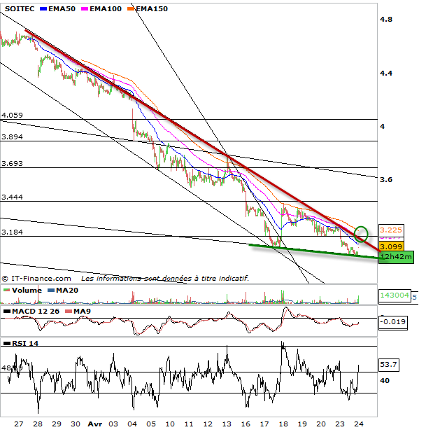 L’action Soitec Silicon comme beaucoup d’actions que je suis évolue aujourd’hui dans son biseau descendant. On reste donc en embuscade pour un rebond même si on reste très prudent et méfiant face notamment aux indices US. En attendant on pourra se placer à l’chat sur Soitec Silicon si l’action dépasse les 3,19 euros ce qui enverrait un signal encourageant des acheteurs quant à la validation de la mise en place d’un rebond haussier durable. on viserait dès lors les 3,58 euros en premier objectif puis les 3,90 euros si cela passe.