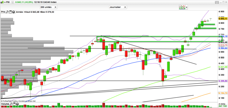 Niveau CAC 40 cela reste haussier point barre avec la zone des 6850 à franchir pour viser 6870. On sent que ça manque de jus mais en même temps on arrive tout de même à grapiller peu à peu. On surveillera le niveau des 6790-6820 qui en dessous symbolisera une volonté de reprendre un peu de souffle. Mais si proche du record de 2000 pour le cac, on peut se dire qu’on voudra peut être faire un effort.