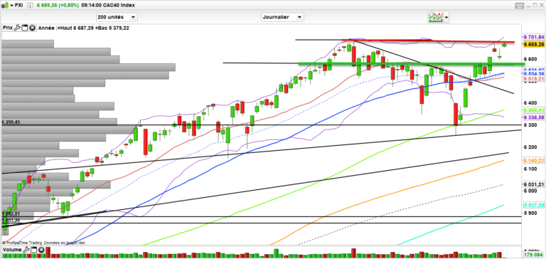 RAS, le CAC 40 reste dans de bonnes dispositions depuis le passage des 6520 points qui reste le niveau de support au-dessus duquel c’est haussier point barre. La zone des 6580 sinon en support plus court terme. Au-dessus, ras, on s’attaque aux plus hauts pour s’ouvrir une nouvelle poussée en direction des plus hauts de 2000 mais on aura 6750 avant.