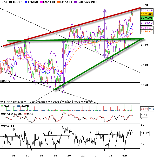 On bute actuellement sur le haut du biseau 3510 points en résistance. Le signal de vente ne viendra que d’une rupture baissière des 3457 points que l’on pourra anticiper sur rupture baissière des 3478 points. Les objectifs d’une consolidation seront dès lors 3380-3365 points.