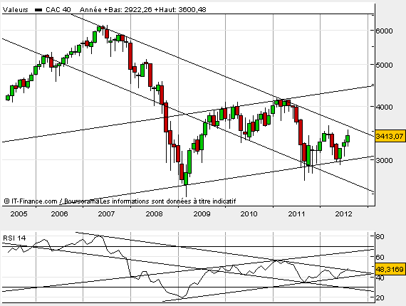 - Comme on peut le voir les cours sont toujours dans une situation complexe. D’une part dans un canal haussier dont la borne basse à permis à l’indice de rebondir en mars 2009, à l’automne 2011,  au début de l’été 2012, d’autre part dans un canal baissier dont la borne haute prend sa source sur les plus haut de l’été 2007 et fait office de résistance à la hausse du cac 40 au printemps 2011, l’entraînant l’été suivant la terrible rechute que l’on sait .