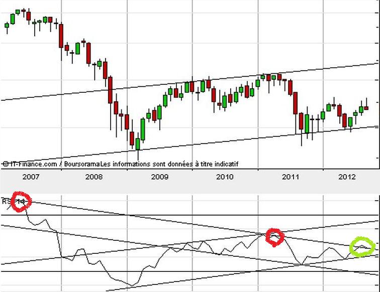 On peut s’apercevoir qu’après avoir cassé le trend baissier long terme sur le RSI au mois d’août, dans un certain anonymat, on vient en cette fin de  mois de septembre de faire un pull back sur ce trend baissier, dans un profond scepticisme.
