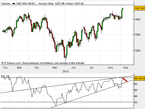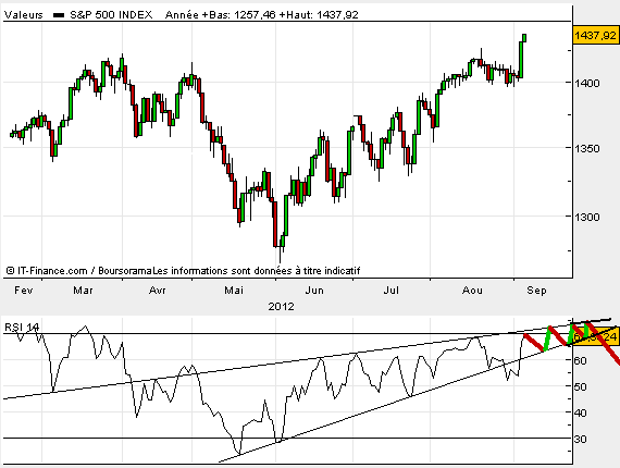 Maintenant faisons le  point en hebdo. Tout comme sur le cac40, parfaitement mis en avant dans le dernier post de K2r sur notre indice  national, Le S&P500 vient de rompre à la hausse le trend baissier de moyen terme sur le RSI. Il faudra sans doute, comme le cac l’a déjà fait, faire un pull back sur cette oblique baissière. Quoiqu’il en soit cette cassure à la hausse est un élément très positif…