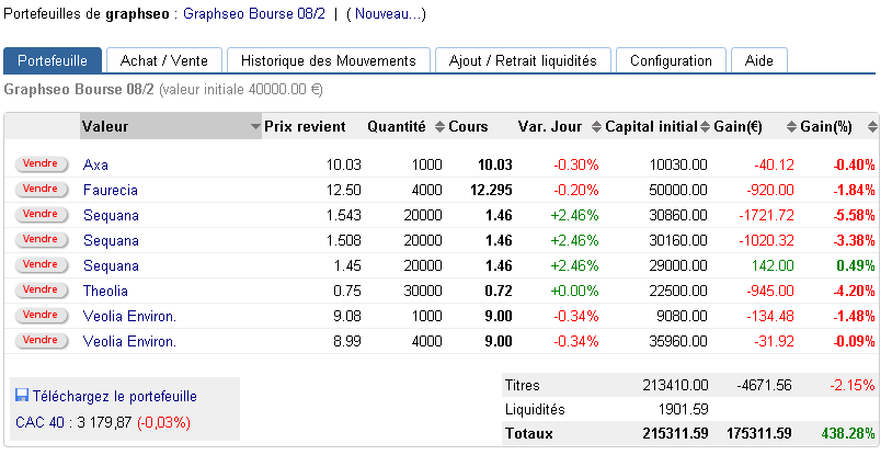 Je conserve des positions acheteuses sur la watch list graphseo bourse avec notamment dorénavant des surpondérations fortes pour Sequana et dans une moindre mesure pour Veolia. Sequana a donné de bons signaux ce jour. il faudrait confirmer en faisant péter les 1,51 euros puis les 1,55 euros, là on aurait droit à un rebond digne de ce nom pour lequel pour le moment j’ai un très mauvais timing. Je crois en outre beaucoup à Faurecia, Peugeot devrait également pouvoir rebondir fortement mais cette descente à la cave me fait peur, et je préfère attendre d’avoir des signaux tangibles d’améliorations avant de m’y pencher. Veolia me paraît reprendre une bonne force relative aux autres valeurs du CAC 40 ce qui fait que je m’y intéresse fortement tout comme Axa pour faire dans les valeurs financières.