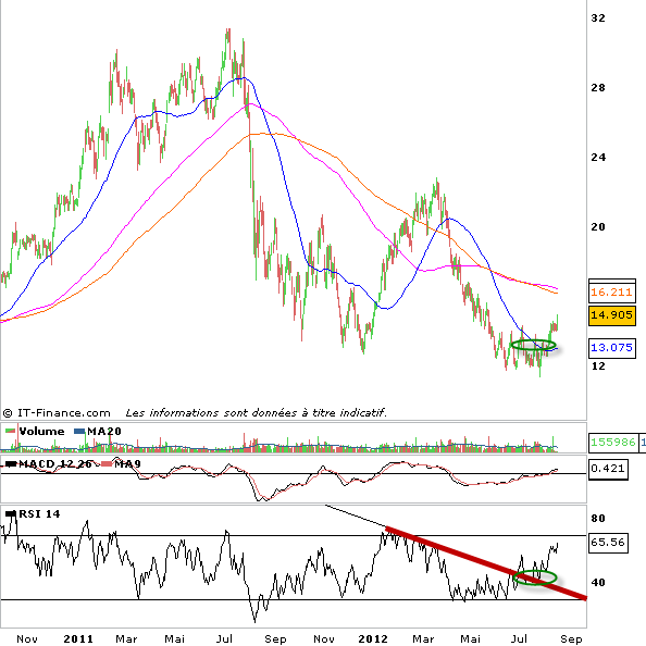 L’action est en surachat dès que l’on dépasse le niveau des 70. En survente sous 30. Le rsi est un indicateur de force de tendance donc. Cependant il faut tordre l’idée reçue qu’une action en surachat va forcément se retourner à la baisse et vice versa. Bien au contraire des actions peuvent continuer de grimper malgré leur surachat. cela prouve la force du mouvement haussier et autant éviter d’être à contre tendance dans de tels forts mouvements. Les périodes de surachat et de survente peuvent mettre plus de temps à se retourner que vous à rester solvables.