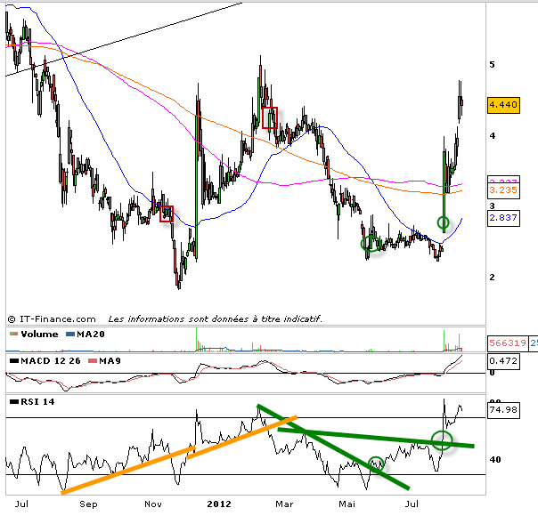 Maintenant vous pouvez utiliser le rsi, il est un outil important pour prendre une décision, mais pas en fonction du surachat ou de la survente mais comme pour un graphique des prix, en fonction des configurations graphiques que l’on peut tracer et notamment sur la possibilité de trader sur des signaux de cassure de trends qui sont souvent plus pertinents et dans le timing que sur le graphique des prix. Voici ci dessous quelques exemples de signaux d’achats et de vente uniquement basés sur des achats et ventes en fonctions de cassures de trends sur le rsi.