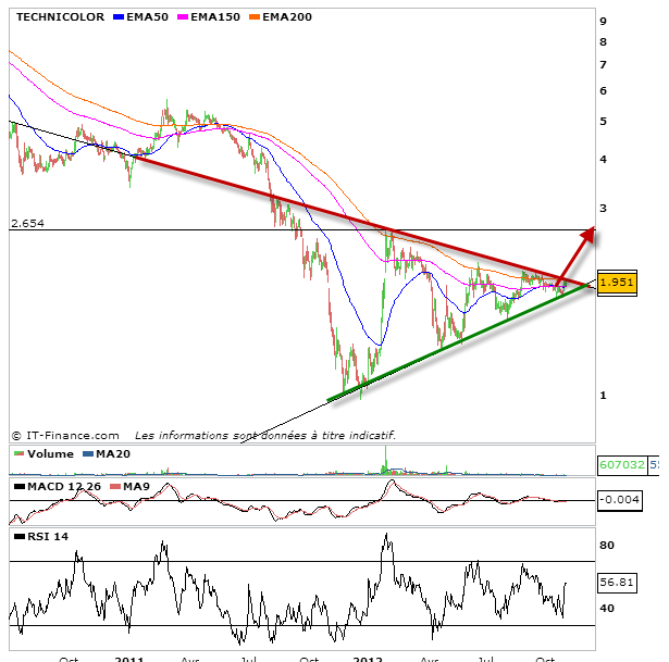 Note rapide pour refaire un point sur l’action technicolor. Comme vous le savez je suis depuis un moment la figure en triangle symétrique en cours sur l’action. il est à noter un retour certain, des volumes depuis quelques séances, et un refus d’aller voir plus bas. Du coup, je me laisse à croire, à un renouveau de technicolor. A suivre de près ces prochaines séances en attendant le signal de top départ…ou pas…