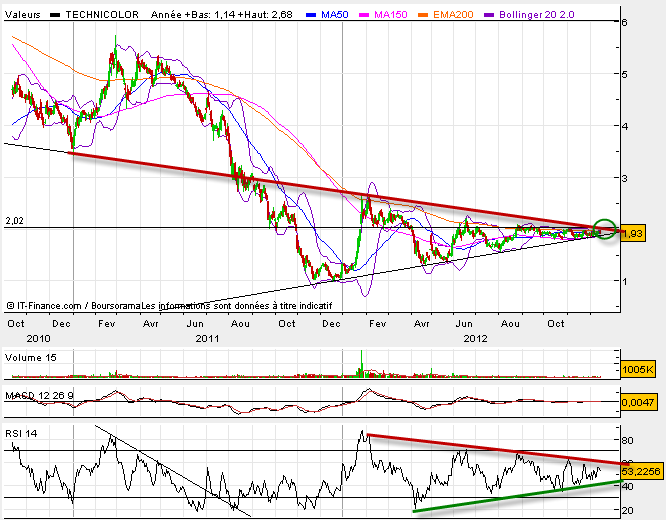 Cela fait maintenant quasiment une année que l’action technicolor a lancé un élan de rattrapage qu’elle consolide depuis 11 mois dans une figure de congestion en triangle symétrique. la figure arrive à son terme et le peu de volatilité du titre, pousse à croire que la sortie se fera de manière forte et violente. Bien entendu c’est plutôt la hausse, qui est privilégiée, même si l’on ne peut avoir aucune certitude tant que l’on évolue sous les 2,02€ qui est le niveau pivot, dont le dépassement validera un nouveau signal d’achat sur l’action technicolor.